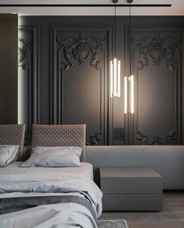调色板变为深色,大理石填满所有的空腔,为空间注入经典的韵律。在灰色蕴含的精致奢华,整个卧室无与伦比的触感被再次激发出来。宽阔的视野中布局朴素却不失格局,一个崭新的宁静之地就这样呈现出来了。