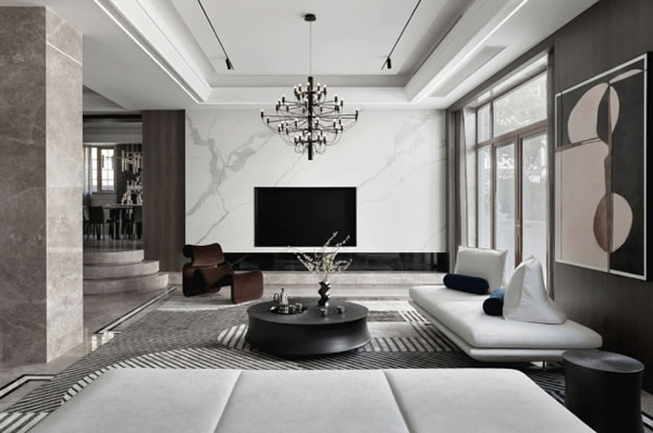 前面观影后面围坐壁炉休闲聊天两个区域设计上整体统一