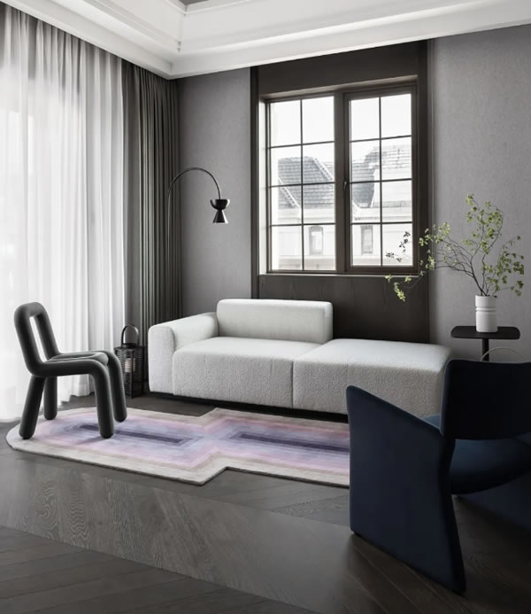 起居室以粉红色的梦幻地毯为视觉中心搭配两张个性单椅空间营造的是时尚潮流的调性
