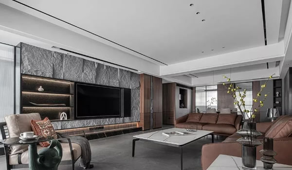 整面的电视墙是点睛之笔,设计采用了叠石的铺设,让那些留有时间印记的灰色自然面石皮,顺着石材的肌理层层蔓延开。