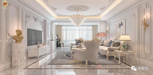 客厅整体空间以白色木制的元素为主,用细线、几何元素细节深化,添加金属感作为点缀,增添给空间更加丰富质感,让法式风情的浪漫在空间中表现的更加淋漓尽致。