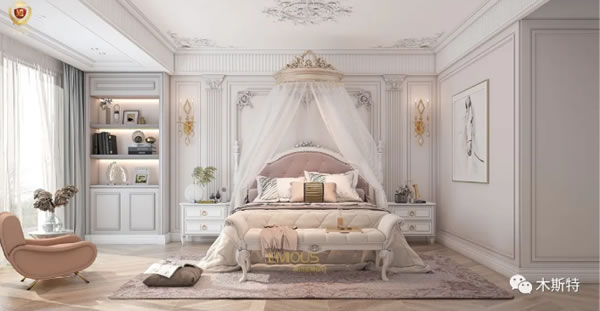 宛如宫廷般的卧室精致优雅,在色调运用上,大部分设计以浅色为主色调,用少许粉色进行点缀。使空间在和谐统一的基础上更具视觉层次感,为空间平添几许温度与生气。