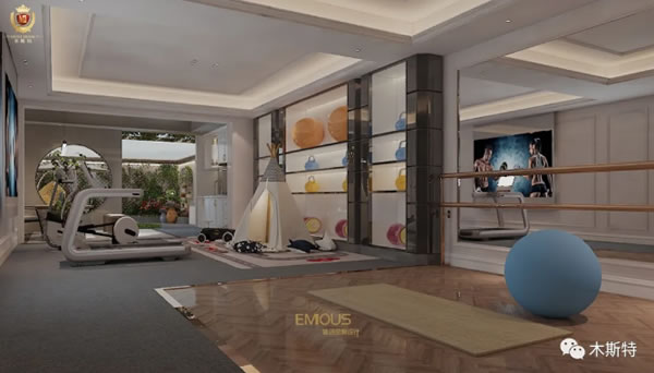 健身房空间设计以休闲为主,运动器械设置在茶室旁,运动累时坐下来品下茶亦可到外面走动下,让运动不会太枯燥。