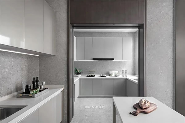 为了满足不同家庭成员的烹饪及饮食习惯,将此空间打造了“社交型厨房”,空间分工后,让中西厨都能有自己独立的空间去织造美食,每当食飨时刻来临,这里总是充满着温馨的言行,灯火影绘中使欢聚显得弥长珍贵。